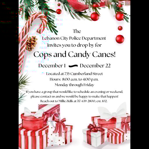 Spread holiday cheer with Cops and Candy Canes – The Lebanon City Police Department is excited to bring back Cops and Candy Canes this holiday season! From now through Monday, Dec. 22, officers will share smiles (and sweet treats!) with kids at the police department at 735 Cumberland St. Follow the festive peppermint trail when you enter the building, and it’ll lead you straight to the police department. Let staff know you’re here, and an officer will greet you with a warm smile and a candy cane. Visit Monday to Friday from 8 a.m. to 4 p.m. A huge thank you to the James Biever Police-Community Alliance for making this event possible and to Wertz Candies for generously donating all the candy canes. Come by, say hello, and let’s make this season a little sweeter together!