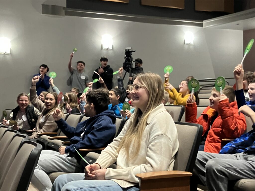 Also booing were the elementary school college majors in Professor Jasmine Bucher’s class, who created questions for the friendly competition and who sat with the student teams in the audience during the event at the Leedy Theater in the Allan W. Mund College Center.