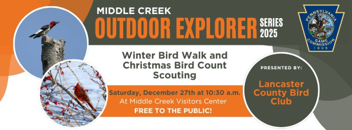 Join Lancaster County Bird Club on Saturday, Dec. 27, for a day in the field and a complement to the Speaker Series event on the history of the Christmas Bird Count. This hands-on experience will allow participants to explore Middle Creek’s winter landscape and observe the season’s local bird species while gaining insight into the process of counting birds for the CBC. Whether you’re a seasoned birder or new to birding, this outing offers a unique opportunity to connect with nature and learn how birding data is collected in the field each year for this community science survey.