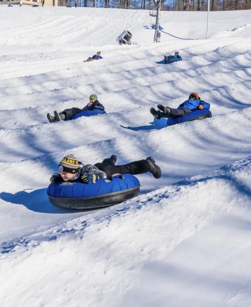 Families can warm up between runs with food and drinks from Miner’s Pub or the snack bar, located in the clubhouse, and enjoy free parking conveniently located next to the tubing hill. Height requirements are in place for safety, and a Kiddie Hill may be available for smaller guests when conditions allow.