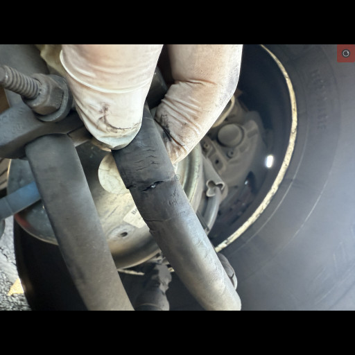 - Picture 3 shows a brake hose that has worn through the reinforcement ply and has a hole in it. There was an attempt at a repair using only electrical tape wrapped in many layers to stop the air leak.