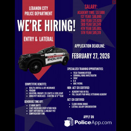 Now hiring – Looking for a rewarding career where every day makes a difference? Join the team at the Lebanon City Police Department and help serve, protect, and strengthen our community! The Police Civil Service Commission is accepting applications for the position of police officer. Applications may be obtained online. No mailed applications will be accepted. The deadline for applications is Friday, Feb. 27.