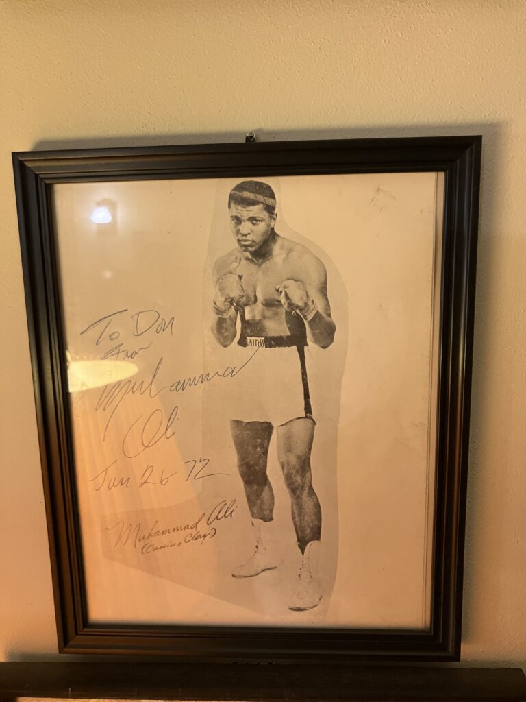 Some notable interviewees include hockey players Bobby Orr and Ron Hextall, race car driver Mario Andretti, and boxers Joe Frazier and Muhammad Ali. Autographed photos of people he’s interviewed or met hang on Scott’s office wall.
