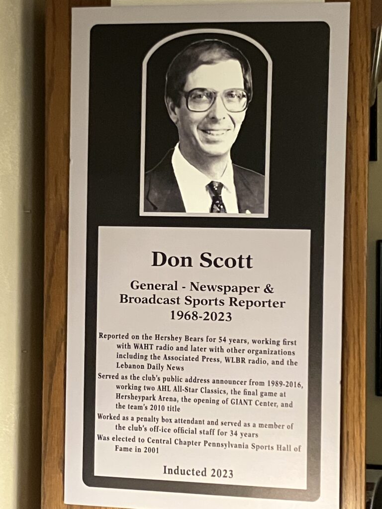Much like his sportswriting career, Scott fell into the role of announcer at Hershey Bears home games beginning in 1989 through 2016.