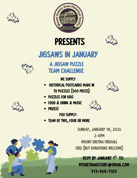The Mount Gretna Area Historical Society presents Jigsaws in January, a jigsaw puzzle team challenge, on Sunday, Jan. 18, from 2 p.m. to 4 p.m., at the Mount Gretna Fire Company.