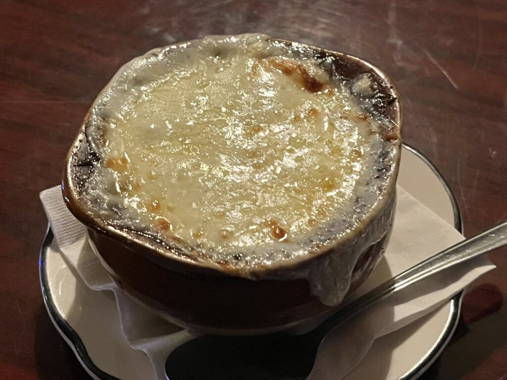 For my meal tonight, I started with a bowl of French onion soup ($7) and had the PB&J Burger ($15) with french fries added as a side.