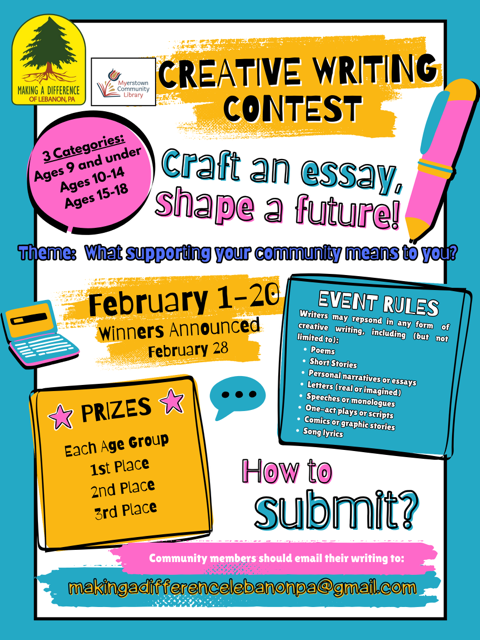 Making a Difference of Lebanon, PA’s Education Committee is also excited to announce a new partnership with the Myerstown Community Library, a proud member of the Lebanon County Library System, to host a Creative Writing Contest throughout the month of February.