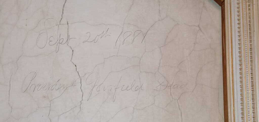 The following morning at Cornwall’s Alden Villa, heavy-hearted from the news, one of Stanford White’s workers was putting finishing touches to the elaborate woodwork over the parlor fireplace. He took the moment to commemorate Garfield’s passing with a pencil inscription. “Sept 20th 1881 President Garfield Dead.”