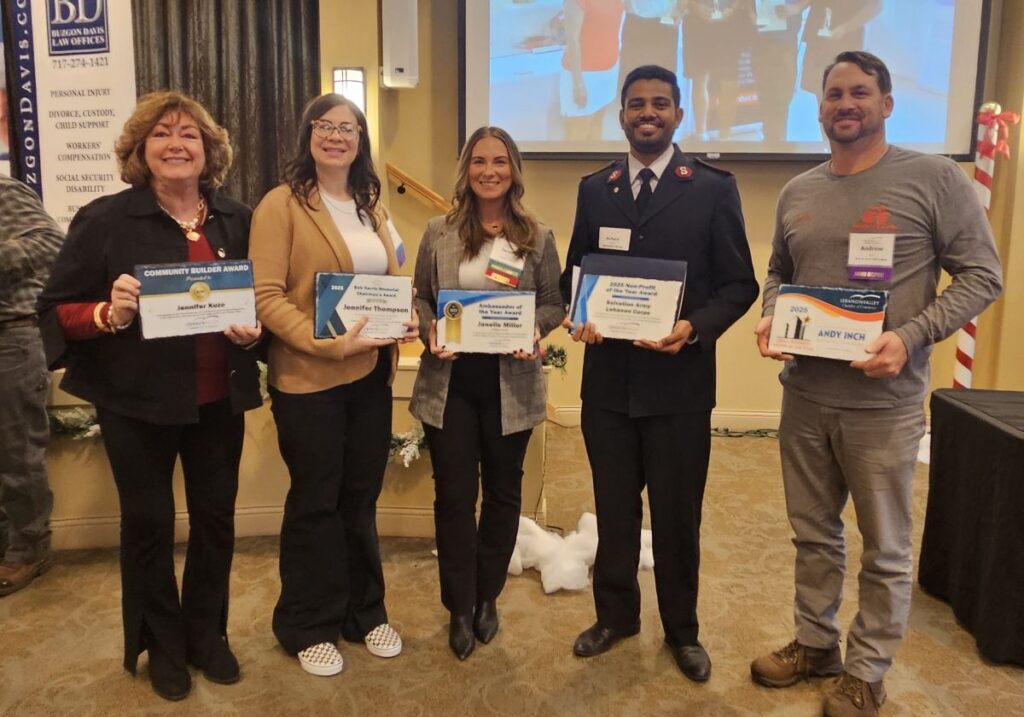 Jennifer Kuzo, former president of Visit Lebanon Valley, received the Community Builder Award. Jennifer Thompson, senior HR manager, VF Corp received the Bob Harris Memorial Chairman’s Award. Janelle Miller, development director, WellSpan Health, won the Ambassador of the Year Award. Richard Mahida, commanding officer, accepted the Non-Profit of the Year Award on behalf of the Salvation Army of Lebanon County. Andy Inch, owner of Inch by Inch Construction, was honored as the Small Business Person of the Year.