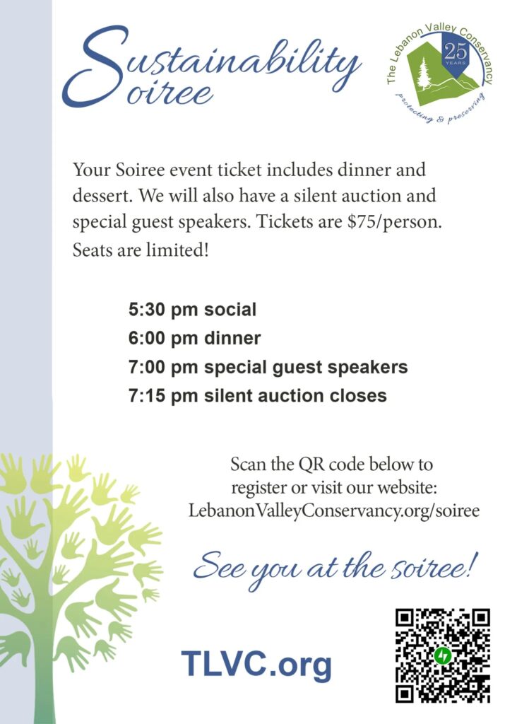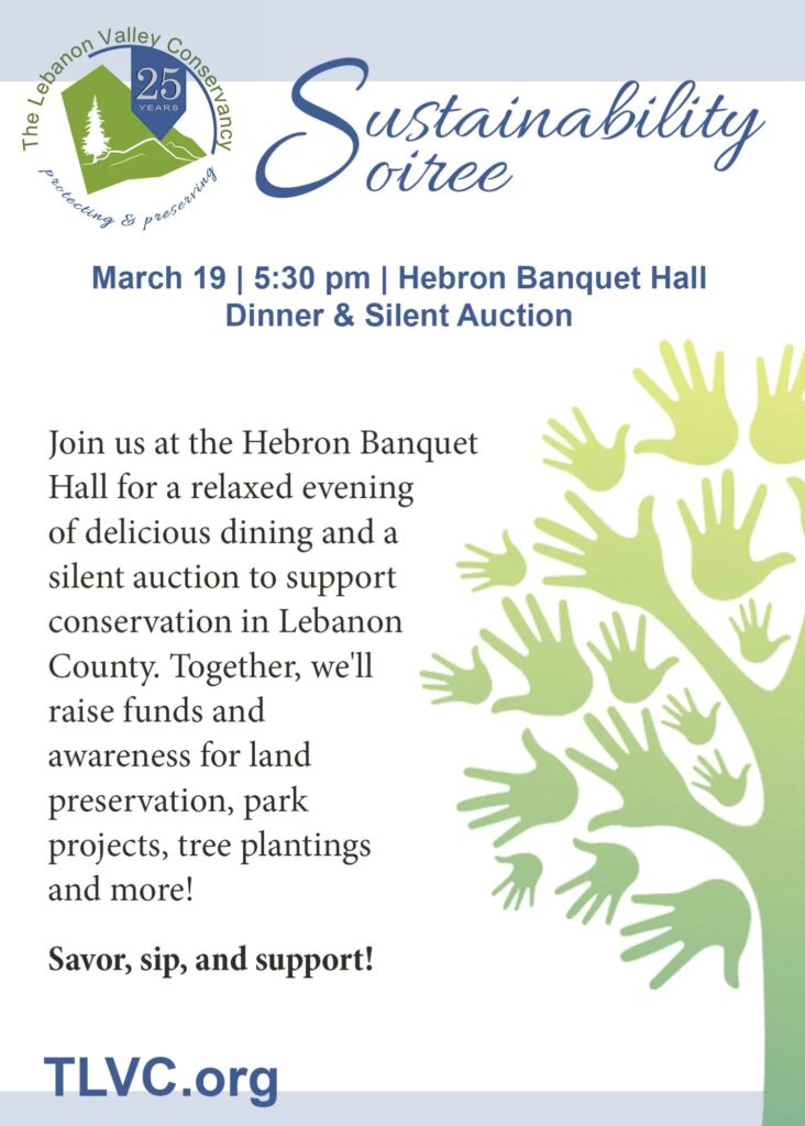 The Lebanon Valley Conservancy (TLVC) invites the community to attend its Sustainability Soirée on March 19 at 5:30 p.m. at the Hebron Banquet Hall.