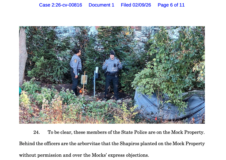 “Worse and most egregiously, upon information and belief, Gov. Shapiro personally directed the State Police to patrol the Mock property,” according to the lawsuit, which also includes a picture of two troopers standing at the alleged disputed site. “On multiple occasions, when the Mocks have attempted to use their property, the State Police have insisted the area was ‘disputed’ and told them to immediately exit their property.”
