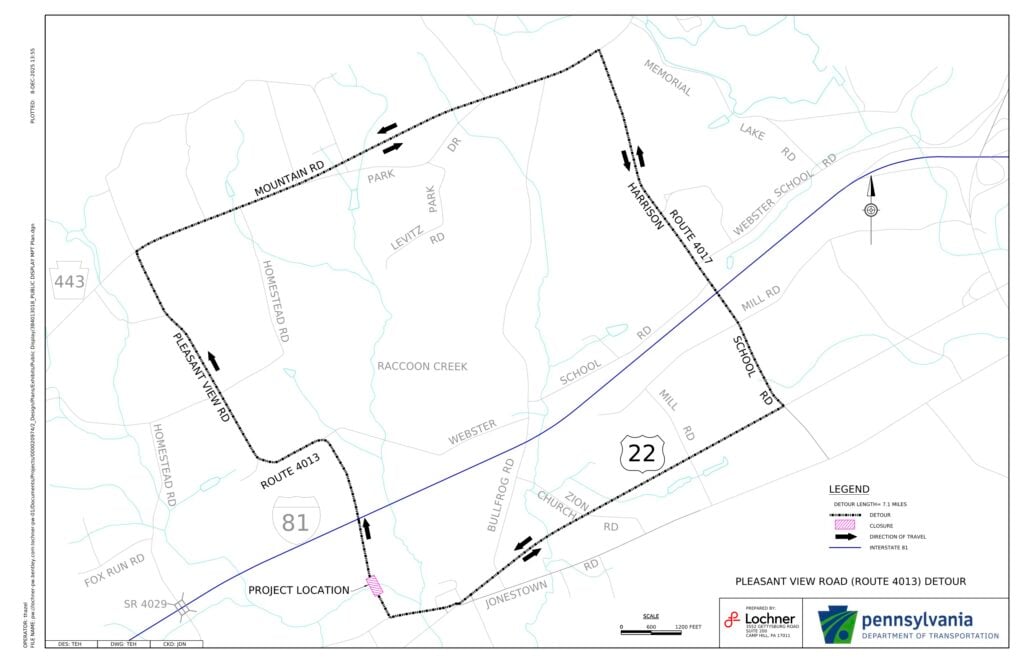 The bridge will be closed during the four-month construction period. A 7.1-mile detour will be used to direct traffic around the closure using Jonestown Road, Route 22, Harrison School Road, and Mountain Road. This section of Pleasant View Road averages 191 vehicles per day, according to PennDOT.
