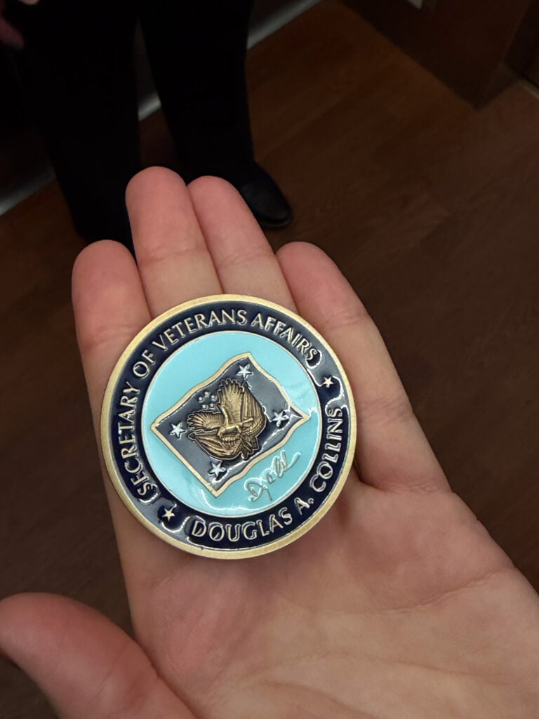 After meeting privately with patients and some of the facility’s 2,200 employees, Collins conducted a “coining ceremony” to honor employees Theresa Haley, Neil Smartschan, Jennifer Distrola, Nora Bairagdar, and Elicia Frank, each of whom had performed services to veterans above and beyond their official job duties.