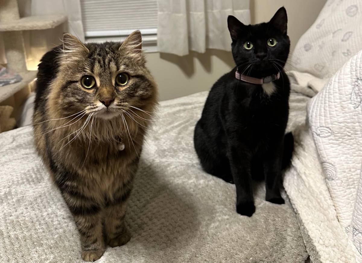“Gypsy is an all black domestic shorthair with a little white patch on her chest. Bear is a long-haired tabby with a little bit of Siberian longhair in her, too,” says owner Katie Hostetter.