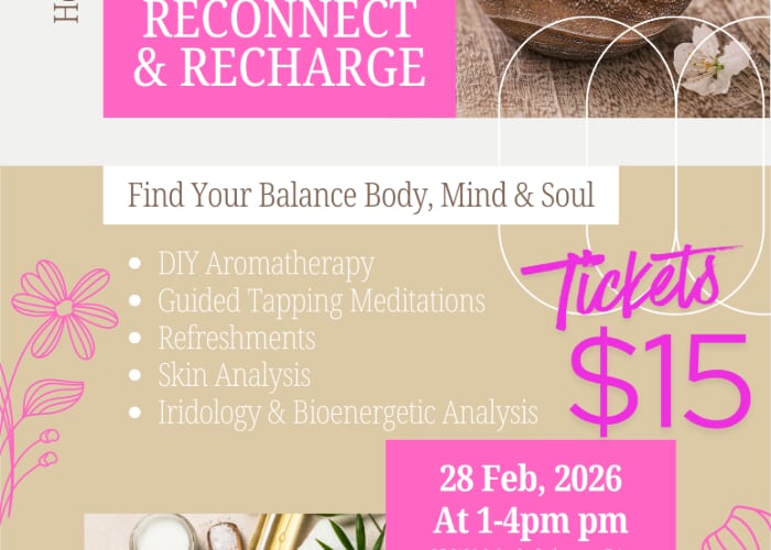 The Heal and Regrow event will feature DIY aromatherapy, guided tapping meditations, refreshments, skin analysis, and iridology and bioenergetic analysis.
