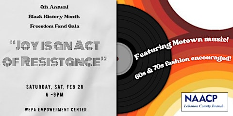 Join Lebanon County NAACP Branch 26AA-B for an evening of fellowship under the banner, “Joy is an act of resistance,” with delicious soul food, Motown music, dancing, and more.