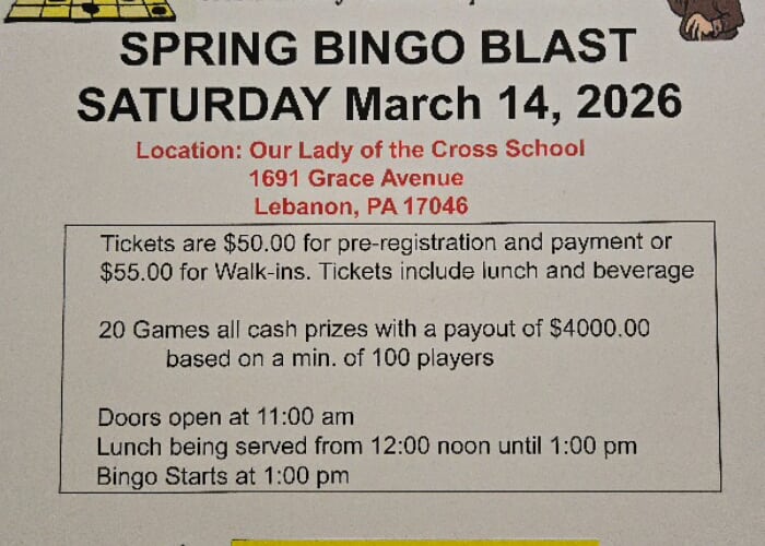Doors open at 11 a.m. There is plenty of easy access parking and easy access to the bingo event, which will be held in a comfortable, single-floor venue.Tickets are $50.00 for pre-registration or $55.00 for walk-ins. Tickets include a delicious buffet lunch starting at noon. For tickets, contact Sam Shrefler at shreflers@att.net or 717-579-7578.