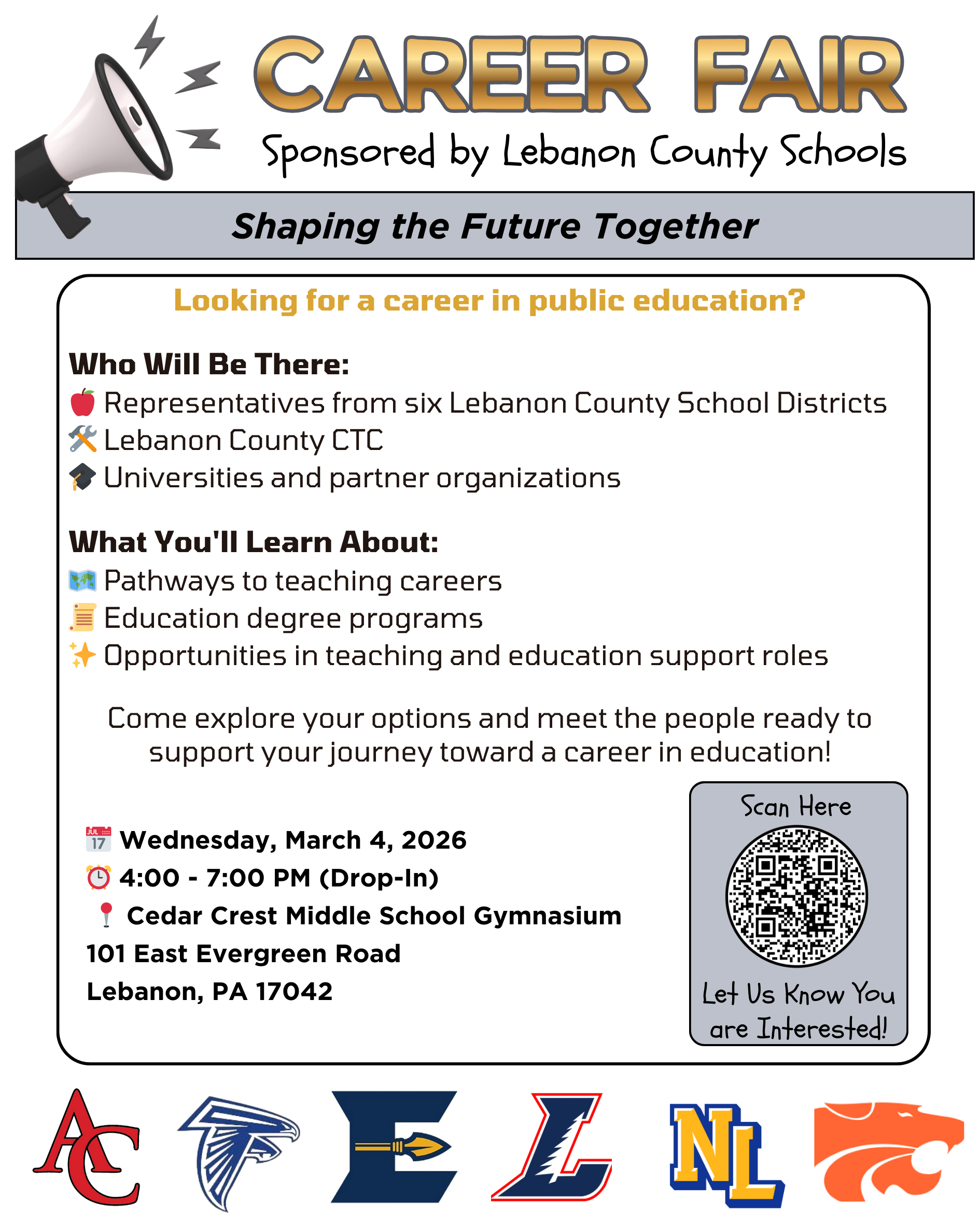 Join us for the Lebanon County Schools Education Career Fair on Wednesday, March 4, 2026. Drop in anytime between 4-7 p.m. in the Cedar Crest Middle School Gymnasium (101 E. Evergreen Rd., Lebanon 17042).