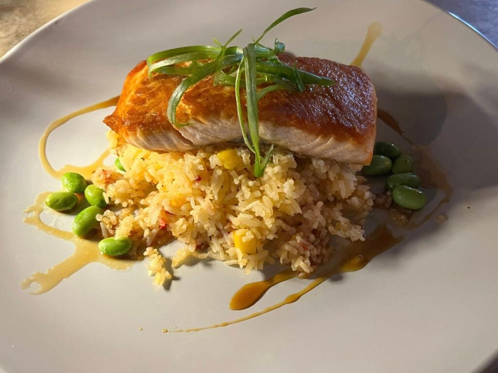 The seared salmon comes with spicy mango jasmine rice, edamame, and lime ponzu sauce. The first thing we notice is the Franklin House cares about presentation. The even sear on the salmon added that nice crunch to the flavorful salmon bite. The lime flavor in the ponzu was nice to have rather than the usual lemon served with most salmon dishes. But I would have liked some more of that sauce on the plate.