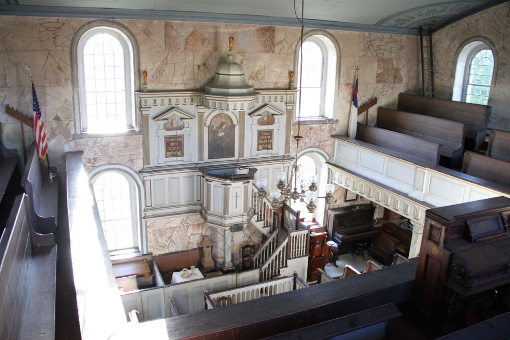 The painted wooden board over the pulpit served as an early sound system that projected the speaker’s voice throughout the church.