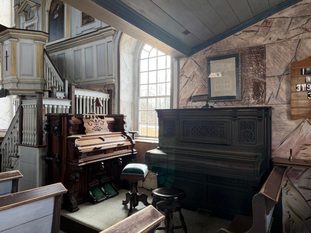 There wasn’t an organ or music originally, though the congregation purchased an organ in 1883, and it’s still sitting in the front corner of the church. It has stands for candles or kerosene lights. The piano also dates from the 1880s, and was given to the congregation by a member.