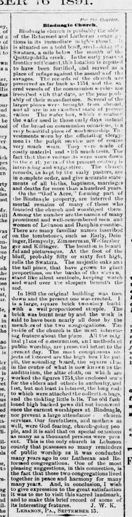 “Bindnagle church is probably the oldest of the Reformed and Lutheran congregations in its immediate neighborhood,” the article states. “In the early years of frontier settlement, this location is reputed to have been fortified, and served as a place of refuge against the assaults of the savages.”