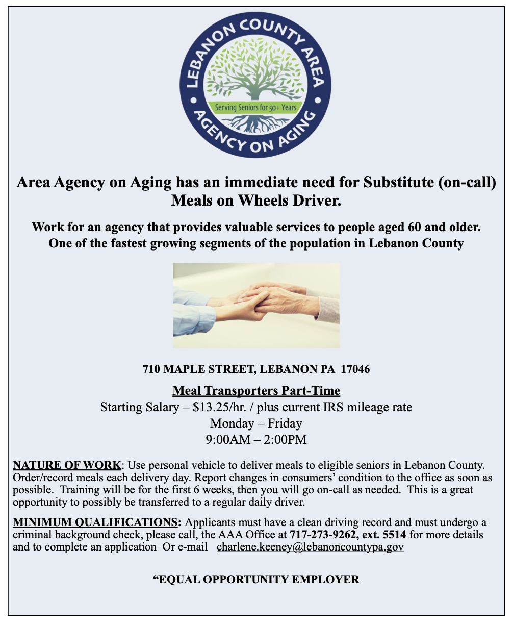 Work for an agency that provides valuable services to people aged 60 and older – one of the fastest growing segments of the population in Lebanon County.