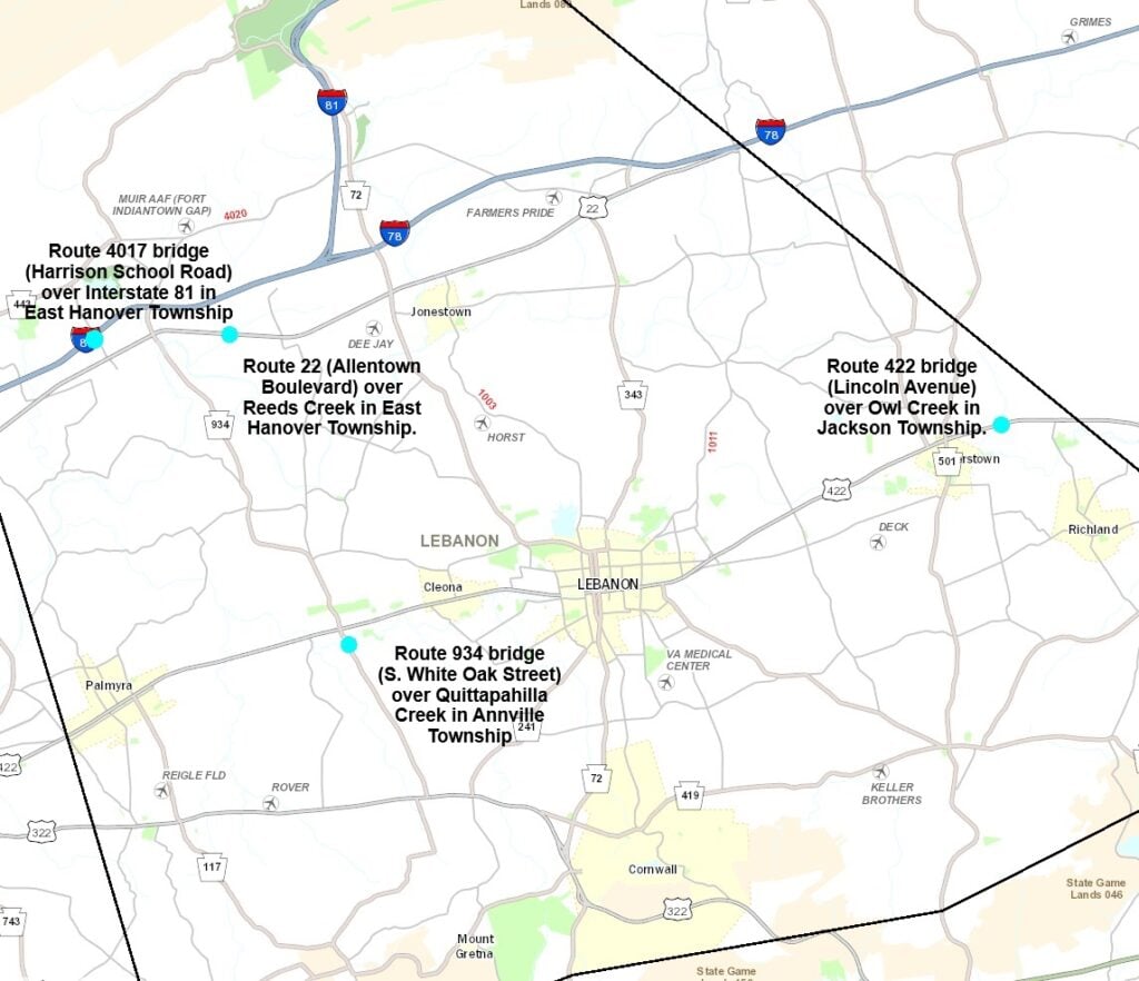 The bridges in question are the Route 22 (Allentown Boulevard) bridge over Reeds Creek in East Hanover Township, the Route 422 (Lincoln Avenue) bridge over Owl Creek in Jackson Township, the Route 934 (South White Oak Street) bridge over Quittapahilla Creek in Annville Township, and the Route 4017 (Harrison School Road) bridge over Interstate 81 in East Hanover Township.