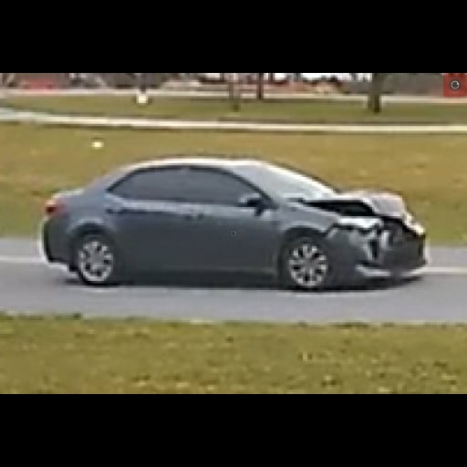 The suspect vehicle is described as a gray sedan, possibly a Toyota Corolla or Honda Civic, with tinted windows. The vehicle is believed to have moderate to severe front-end damage, with the hood pushed upward in a “v” shape.
