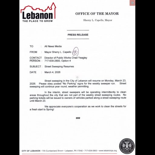 Street sweeping enforcement notice – Street sweeping enforcement will resume the week of March 23. Follow all “No Parking” signs during the scheduled weekly sweeper runs to avoid citations or towing. The Lebanon City Police Department thanks you for helping keep the community clean!