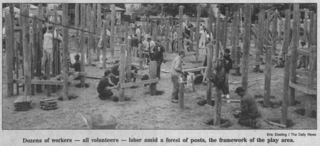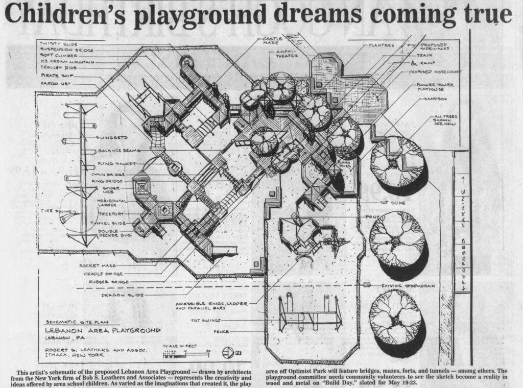 Built by the community under the leadership of the Lebanon Area Playground Committee and using ideas sourced from county children, the playground was designed by the Leathers architectural firm. Joni Kantor and the late Anita Winer were volunteer co-chairs of the project.
