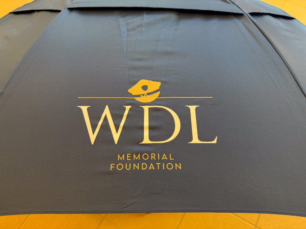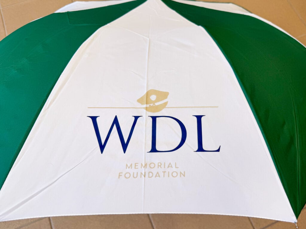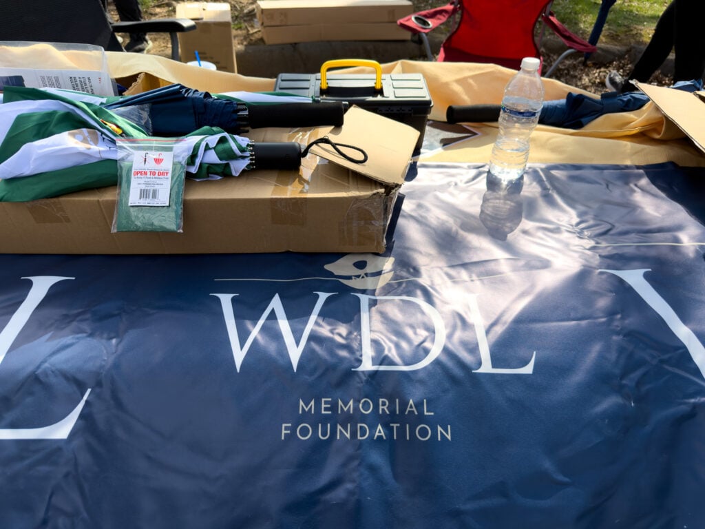 Lebo was known for walking or biking to work every day, always carrying his green and white umbrella in case of rain. The rain-or-shine walk mimics his daily walk to work, and participants may buy umbrellas in his honor.