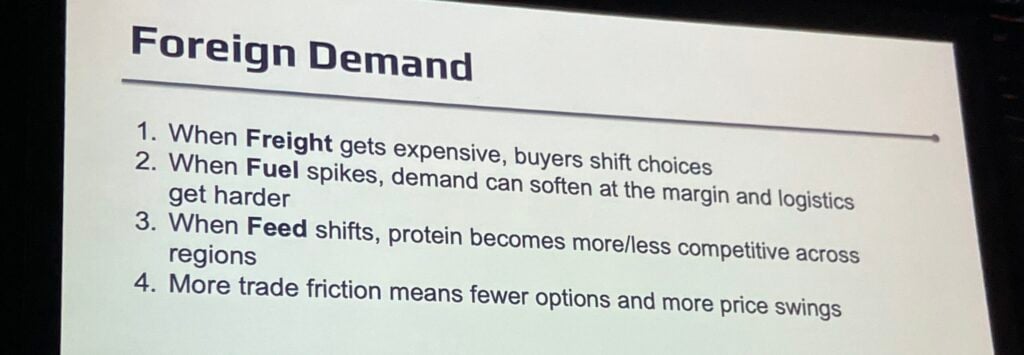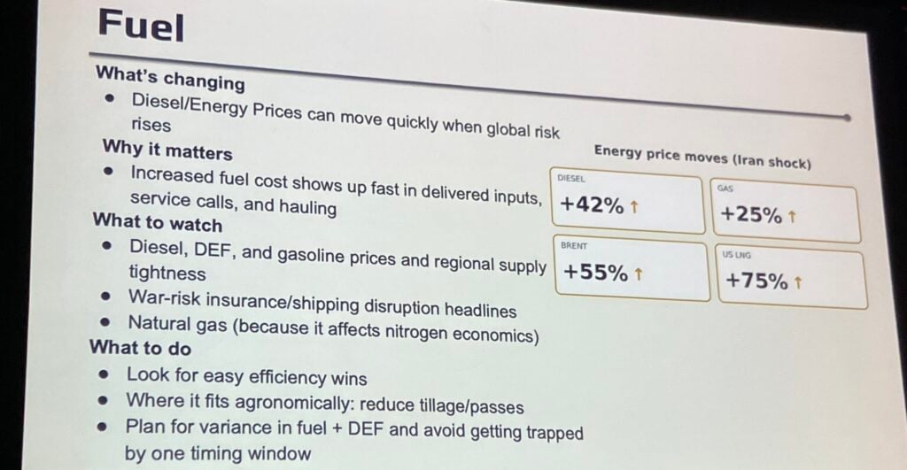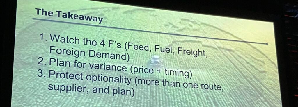 Howell said near the start of her 45-minute presentation that a farmer’s global roadmap should focus on feed, fuel, freight, and foreign demand. Given current events in Iran, part of her presentation looked at how fuel costs might impact the future of agriculture.