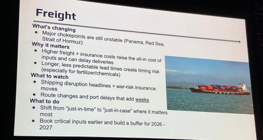This matters, she said, because higher freight and insurance costs will raise the all-in cost of inputs and can delay deliveries, and longer, less predictable lead times create timing risk – especially for fertilizers and chemicals.