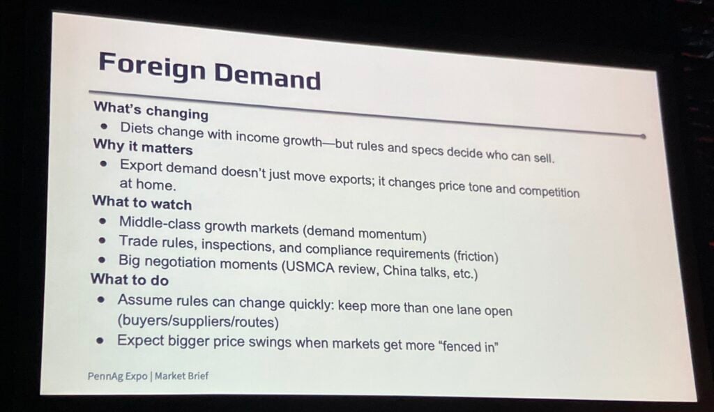 “In 2025, we saw the largest trade deficit on record for U.S. agriculture, meaning that we imported quite a bit more product than what we exported beyond our borders,” she said. “As we look from where we were in ’25 to where we’re going in ’26, the picture is starting to take a little bit of a rosier shape. In 2026 we’re still anticipating a fairly large trade deficit compared to previous years. … So that is certainly still not where we want to be with so much of our revenue tied to exports, but it is trending in the right direction.”