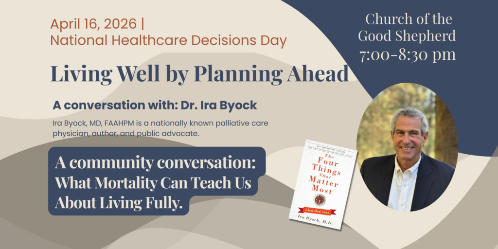 - Community Conversation (7:00 – 8:30 p.m.) – Open to the public and held at the Church of the Good Shepherd, 1500 Quentin Road in Lebanon, Living Well by Planning Ahead: What Mortality Can Teach Us About Living Fully invites individuals and families to reflect on what matters most and how planning ahead can help us live with intention, and bring clarity, confidence, and peace of mind. A copy of Dr. Byock’s book will be given to the first 150 attendees.