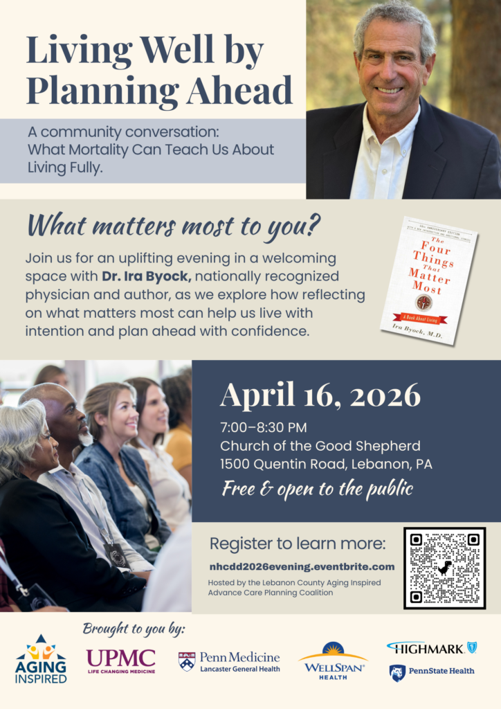 “National Healthcare Decisions Day is about more than forms and checkboxes—it’s about your wishes and on-going conversations with loved ones that bring peace of mind,” said Kathleen Hetrick, Coordinator of the Aging Inspired Advance Care Planning Coalition. “I know from my own personal experience how critical these conversations are for helping our loved ones. We are honored to bring Dr. Byock to Lebanon County to help inspire those conversations throughout our community and across healthcare wherever it is provided.”