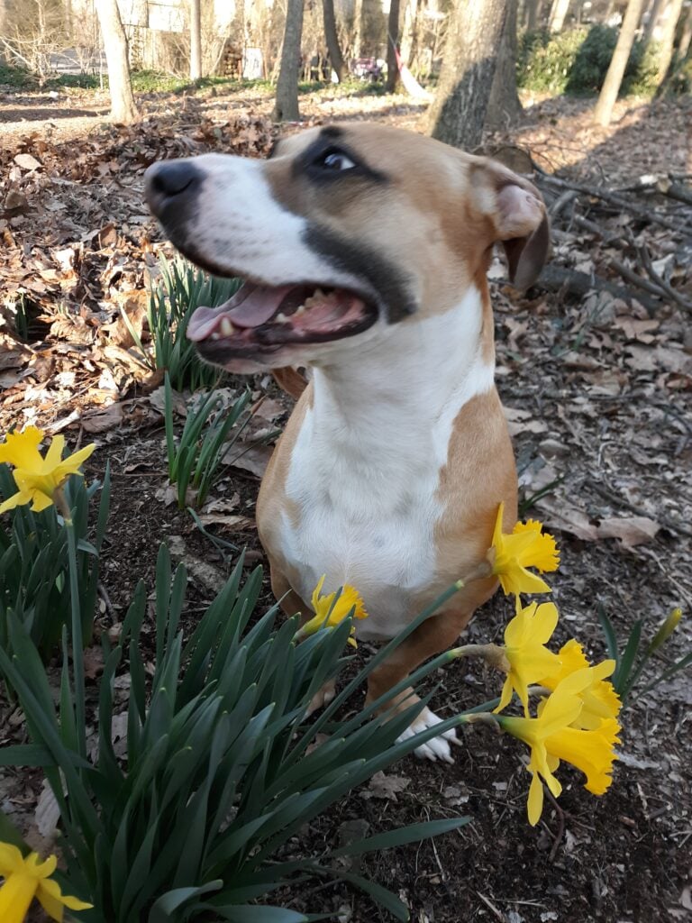 This pup is a bit of a Heinz 57, Erika says, topping the list of breeds with American Staffordshire terrier, French bulldog, and Boston terrier.