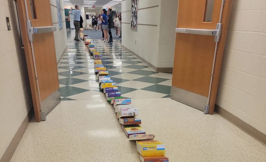 “Before the cereal reaches local food pantry shelves, however, students will celebrate by using the donated boxes for a unique and exciting activity: building a massive cereal box domino course that will weave its way throughout the school hallways!” Wissinger said in the release.