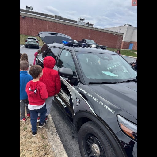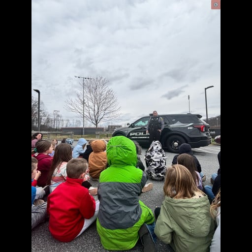 During his visit, Officer Moser spoke with elementary students about his role in the community, answered their thoughtful questions, and provided insight into day-to-day police work. The highlight for many was getting up close to a patrol vehicle — checking it out, seeing the lights in action, and of course, hearing the sirens.
