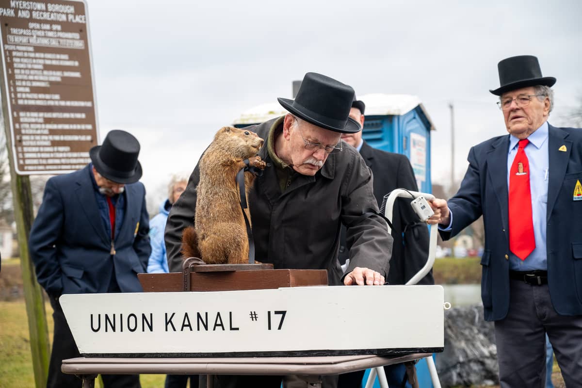 On Friday, Feb. 2 – Groundhog’s Day – Union Kanaal Grundsau Lodsch #17 gathered at the Myerstown Recreation Park on South College Street to receive and share the 43rd annual forecast by Lebanon County’s own Uni.