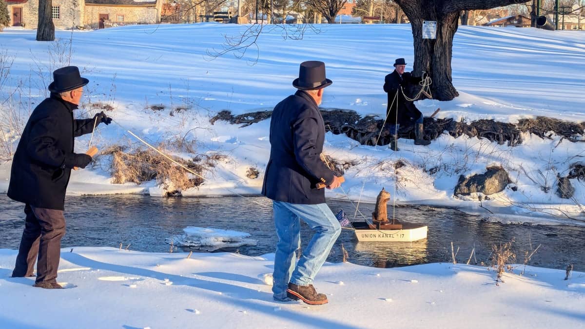 During a chilly ceremony conducted by the Union Kanaal Grundsau Lodsch #17 of Eastern Lebanon County Monday morning, Uni predicted six more weeks of winter, evidently seeing his shadow as he traversed the Tulpehocken Creek.