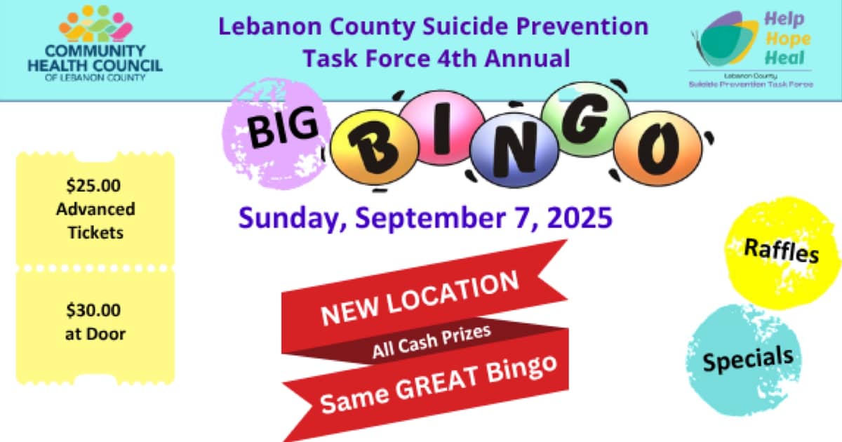 The Lebanon County Suicide Prevention Task Force will host an “All Cash Bingo” fundraiser on Sunday, August 27, 2023, at St. Cecilia’s Parish, 750 State Drive, Lebanon.