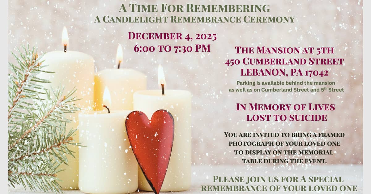 The Lebanon County Suicide Prevention Task Force will host its annual Remembrance Ceremony on Thursday, December 4, 2025, from 6:00 to 7:30 p.m. at the Mansion at 5th located at 450 Cumberland Street, Lebanon.