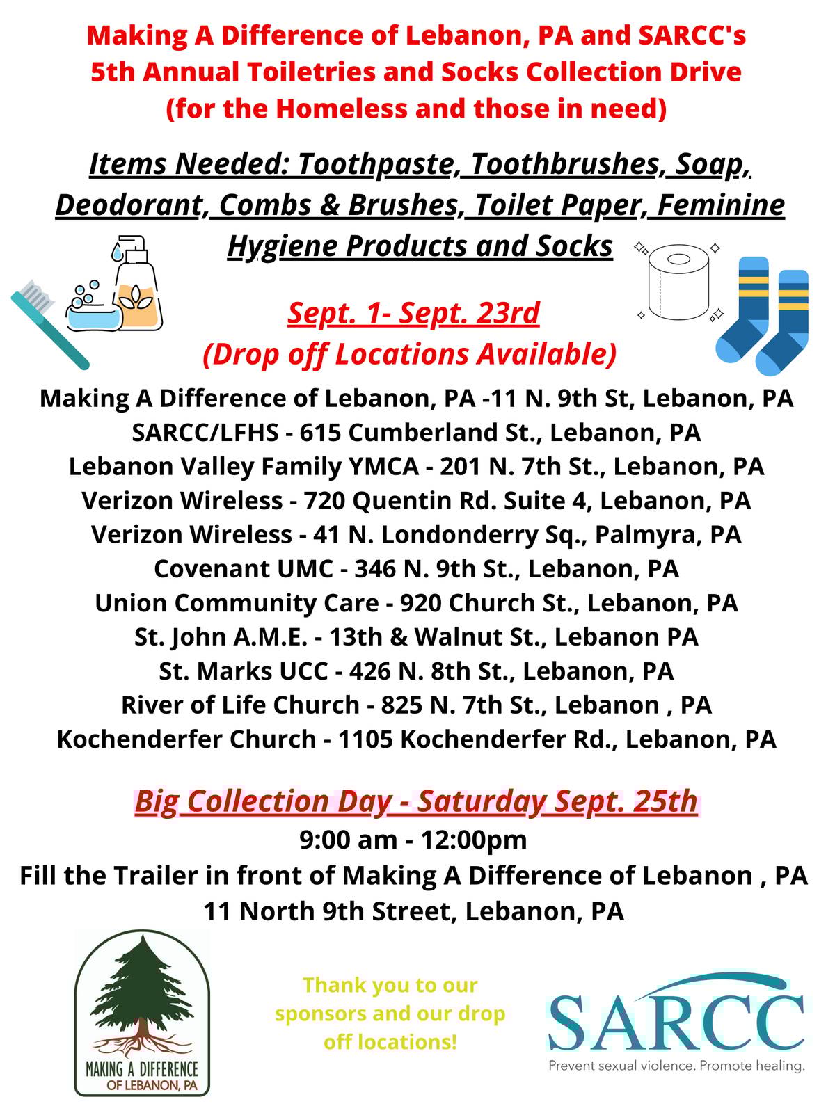 Making A Difference of Lebanon, PA and SARCC are hosting the 5th Annual Toiletries and Socks Collection Drive. The drive takes place from September 1 until September 25.