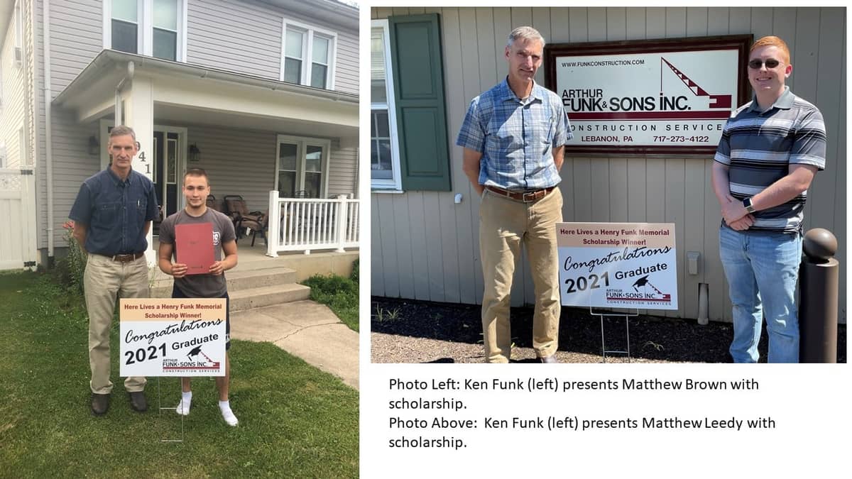 The leadership team Arthur Funk & Sons, Inc., Construction Services, recently announced the two students awarded the Henry Funk Memorial Scholarship. The students are Matthew Brown, a senior at a Lebanon High School, and Matthew Leedy, a senior at Cedar Crest High School.
